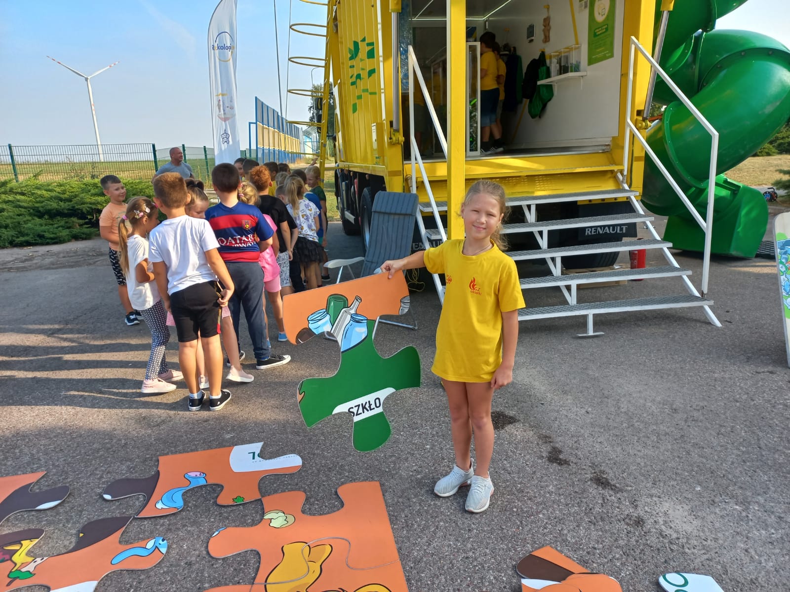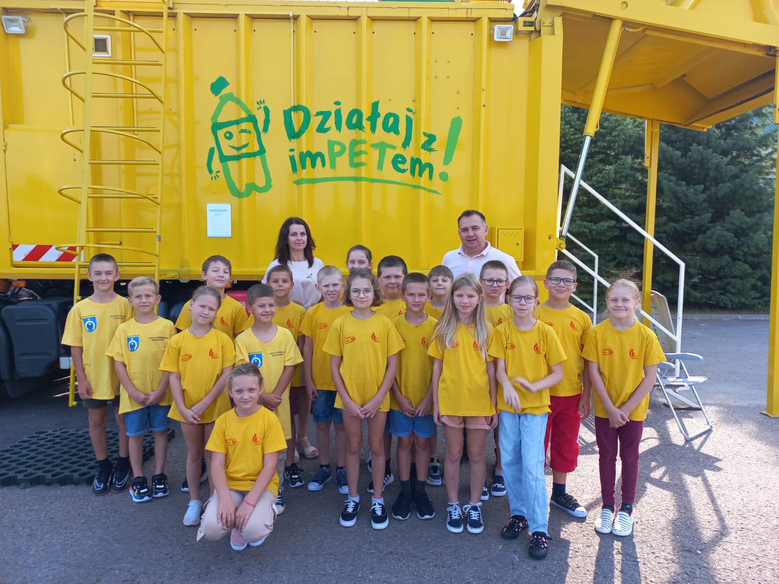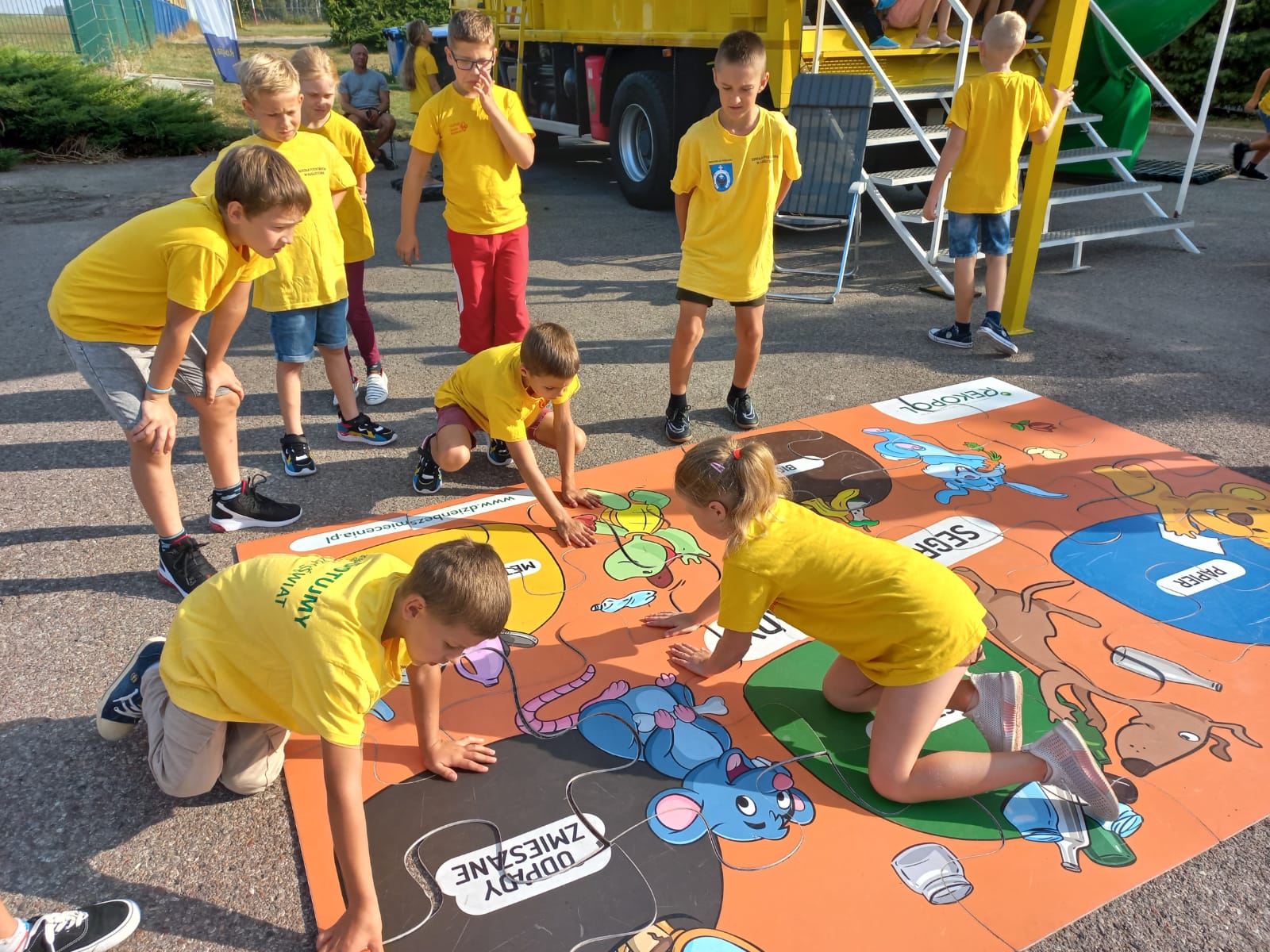 Po przekazaniu nagród rzeczowych przyszedł czas na nagrodę główną – wizytę Mieci. 13 września mobilne centrum pojawiło się przed szkołą. Entuzjazm i zainteresowanie dzieci i młodzieży było ogromne! Zwycięzcy powitali śmieciarkę w żółtych koszulkach, nawiązujących do koloru pojazdu. Podczas prowadzonych krótkich warsztatów sprawdzali swoją wiedzę na temat segregacji odpadów, a także poznawali ciekawostki ze świata recyklingu. Zabawom i pytaniom nie było końca. Młodzi zdobytą wiedzę obiecali szerzyć między rówieśnikami i rodzinami. Jak zawsze, również i tym razem dużym zainteresowaniem cieszyła się zjeżdżalnia.
